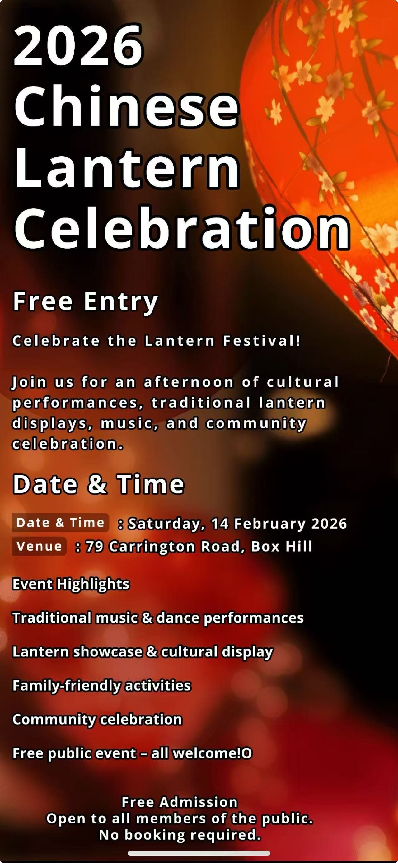 The 2026 Chinese Lantern Celebration is a free, family-friendly community cultural event celebrating the Chinese Lantern Festival. The event will feature traditional music and dance performances, lantern showcases, cultural displays, and activities suitable for all ages. It aims to bring the community together to enjoy cultural diversity and shared celebration.