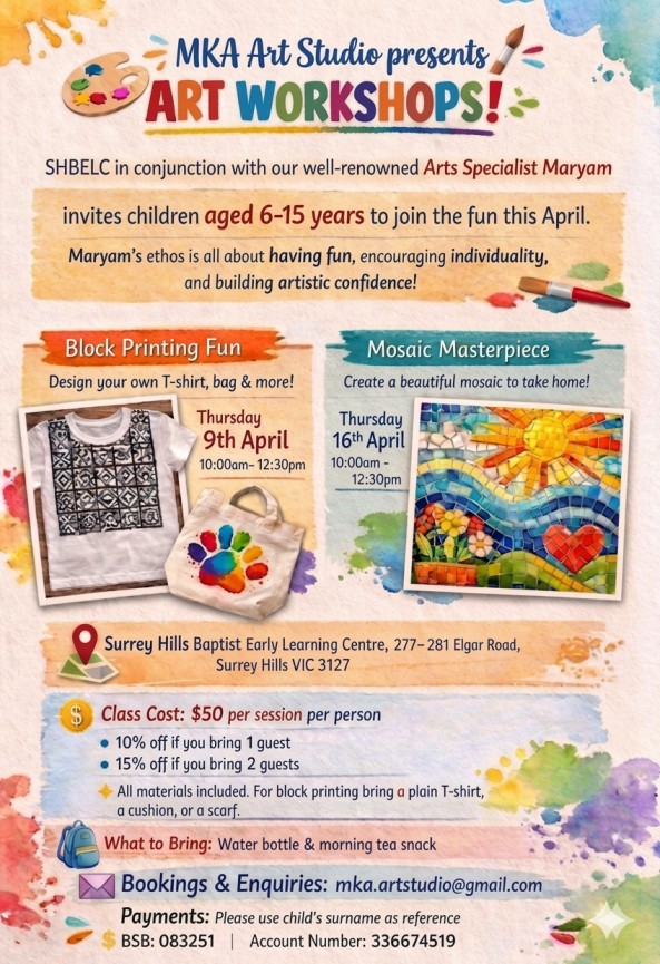 Children will learn simple block printing techniques to create patterns and designs, and explore mosaic art by arranging colourful pieces to form unique compositions. Each activity is designed to be fun, age-appropriate, and accessible for children of all abilities.